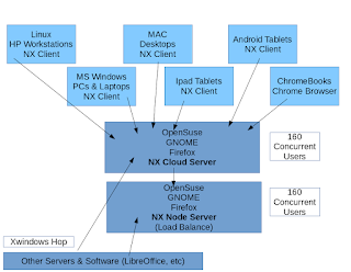 The simplified diagram below shows how end points connect. A NX Cloud server is the exposed server, and watches for connections over the NX protocol and for logins with a web browser. A second Node server sits behind the Cloud server and will provide load balancing of users. In the old "remote X" configuration, Firefox was running on its own server and had an Xwindows hop back to the workstation. This worked great for many years, but with recent changes in video content and HTML construction, it's gotten too slow. Now, Firefox is housed on the same server providing the NX transport and this has provided a huge speed gain. Pages load and scroll immediately and typing is perfectly crisp and fast. Other software applications that are not as impacted by running over remote X, are still housed on remote servers. If you click on LibreOffice for instance, it's handed off to another server -- it then hops over Xwindows back to the GNOME/NX server and out to the endpoint device via the NX compression.